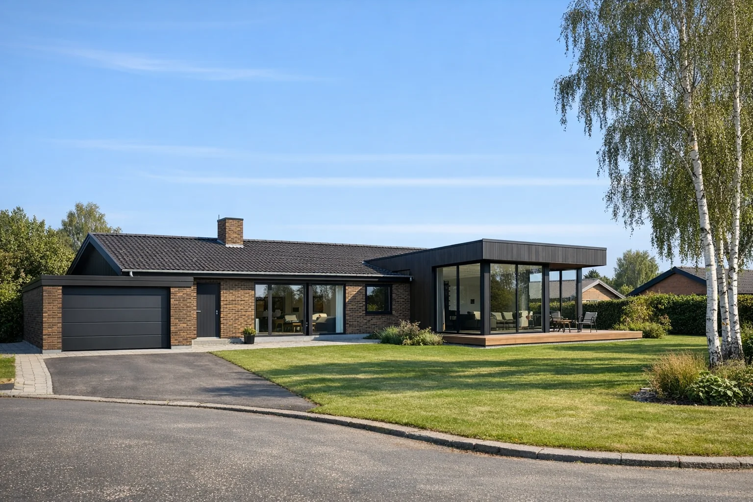 Den mest diskrete løsning: forlæng huset i den ene ende med matchende materialer og tag. Det ser ud som om tilbygningen altid har været der. Mange producenter har tegninger til denne type.
